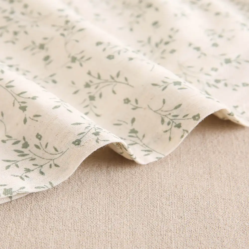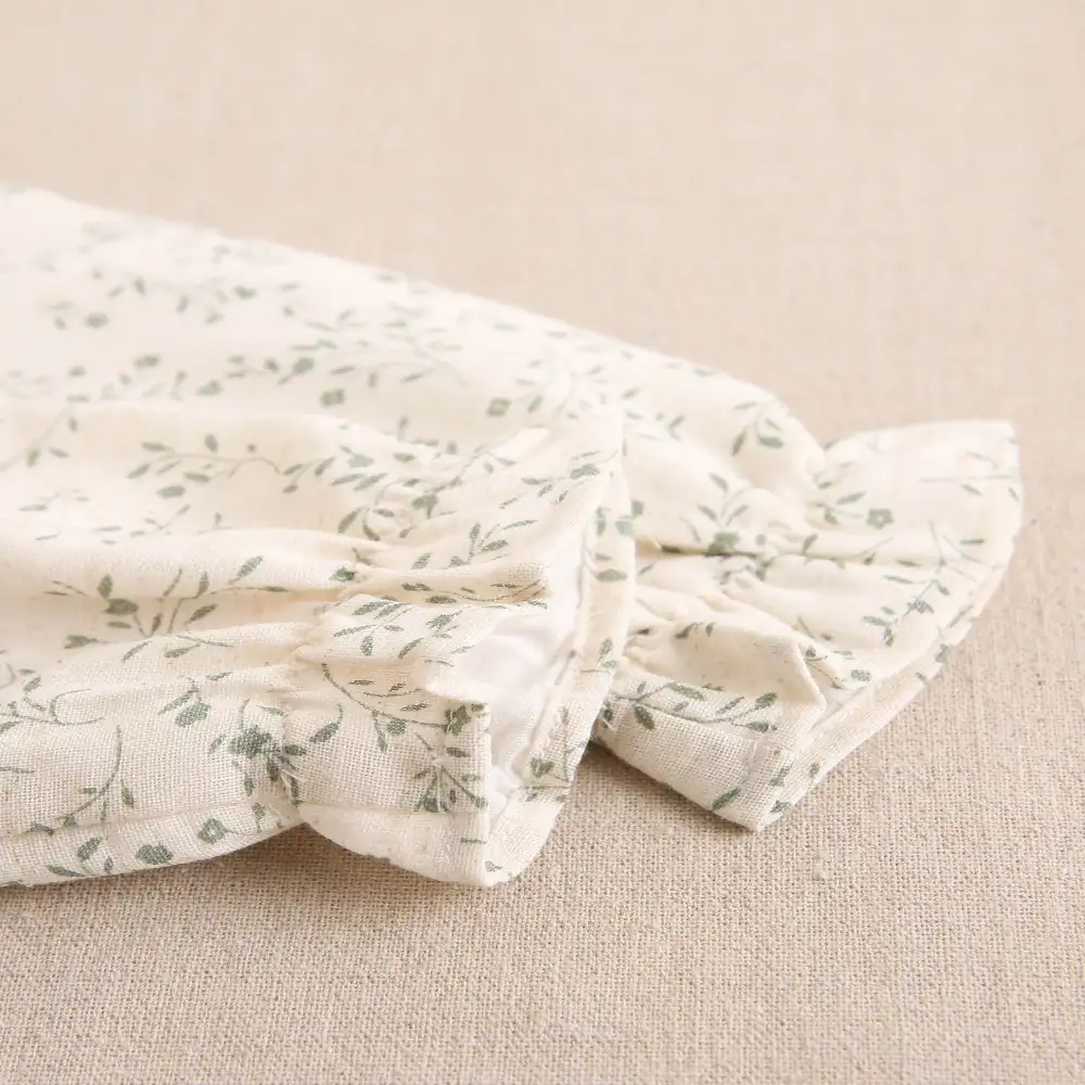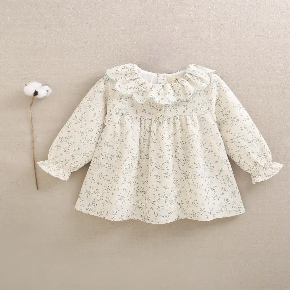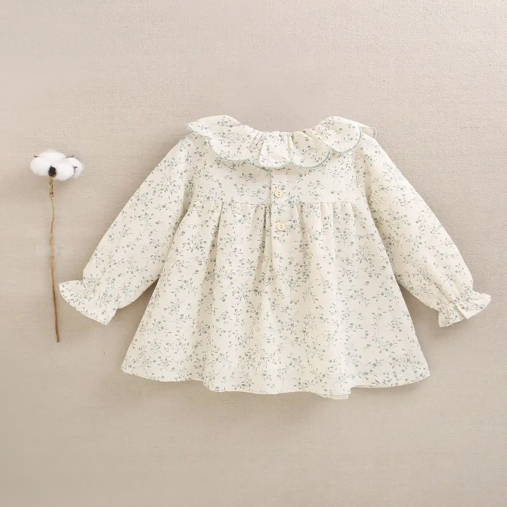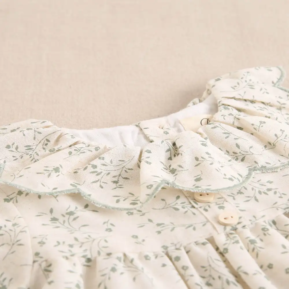 Vestido de bebé niña color crudo con estampado floral verde y volante en el cuello